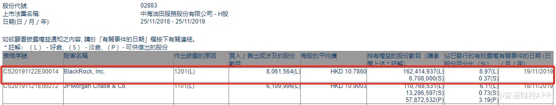 智通财经APP获悉,港交所最新资料显示,11月19日,贝莱德减持中海油服(02883)806.16万股,每股作价10.79港元,总金额约为8698万港元。减持后最新持股数目约为1.62亿股,最新持股比例为8.97%。