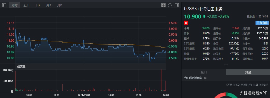 截至今日收盘,中海油服(02883)跌0.91%,报10.9港元。