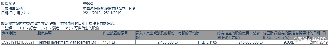 智通财经APP获悉,港交所最新资料显示,11月20日,Hermes Investment增持中国通信服务(00552)246万股,每股作价5.11港元,总金额约为1257万港元。增持后最新持股数目约为2.16亿股,最新持股比例为9.03%。