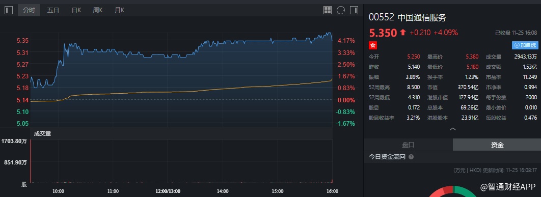 截至今日收盘,中国通信服务(00552)涨4.09%,报5.35港元。