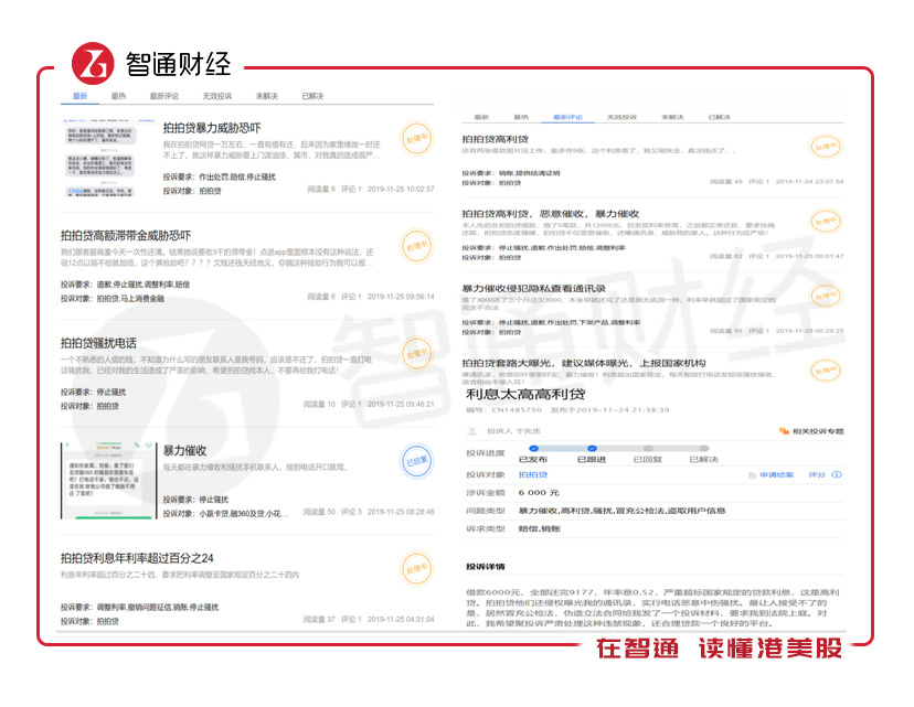 智通财经APP通过聚投诉官网官网了解到,拍拍贷的名气并不好,按年度投诉量看,该公司排名第8,同比上升了36名,而投诉解决量排名79名,同比下降了58名,投诉解决率仅为16.46%。在聚投诉上,用户对拍拍贷投诉最多的为高利贷、暴力催收以及打骚扰电话等现象。