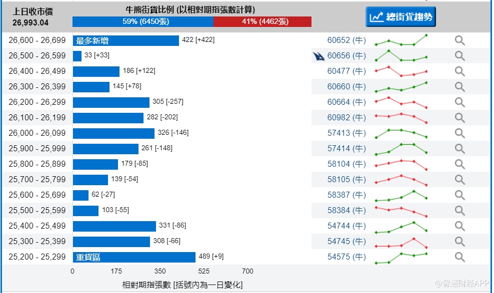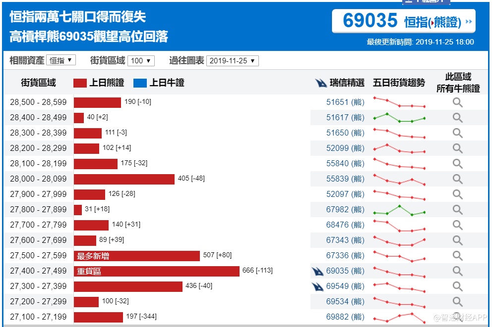 智通财经APP获悉,截至11月25日,恒指最新的牛熊街货比例59:41。瑞信恒指牛熊证街货分布图中的数据显示,熊证街货重货区在27400-27499区间,该区间最新熊证数量为666张,较上一交易日减少113张,最多新增在27500-27599区间,较上一交易日增加80张。牛证街货重货区在25200-25299区间,该区间最新牛证数量为489张,比上一交易日增加9张;最多新增在26600-26699区间,较上一交易日增加422张。
