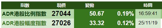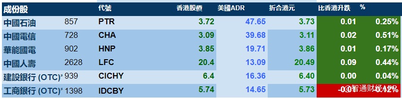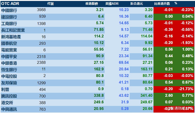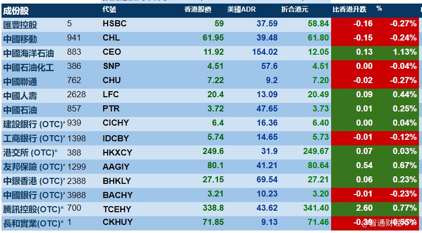 智通财经APP获悉,美股三大股指再创历史新高,港股ADR指数小幅上升,按比例计算,收报27044点,升50.67点或0.19%。大型蓝筹涨跌不一,汇丰控股收报58.84元,较港收市跌0.16元;腾讯控股收报341.4元,较港收市升2.60元。