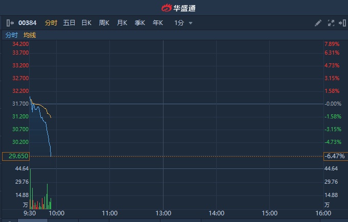 跌5.68%,报29.9港元,成交额7387.06万港元。