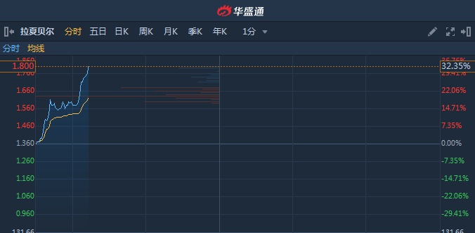 智通财经APP获悉,拉夏贝尔(06116)超跌反弹,A股暂现二连板,H股涨幅扩大逾30%,截至10时12分,涨32.35%,报价1.8港元,成交额2290万。