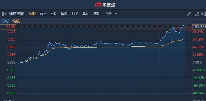 智通财经APP获悉,钱唐控股(01466)将于本周五(11月29日)披露中报,尾盘再获资金追捧,涨幅扩大逾100%,突破多条均线。截至15时46分,涨102.94%,报价0.138港元,成交额5832万。