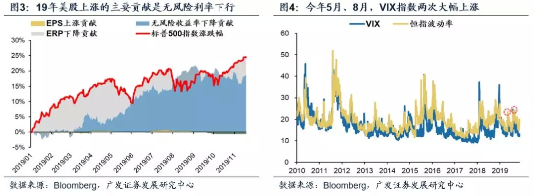 对于全球大类资产而言,2019年是“喜大于忧”的一年。美联储等多国央行重启降息,欧央行再次进入QE。在全球央行“竞赛式宽松”的背景下,利率和波动率下行驱动风险资产估值扩张,主要权益资产价格反弹。以标普500指数收益率为例,年初至今美股上涨的核心贡献来源于利率下行与风险偏好改善驱动的估值扩张,而其中利率下行的贡献最为显著。