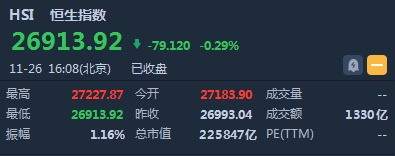 智通财经APP获悉,恒指今日高开低走,早盘曾高开190.86点或0.71%,报27183.9点。随后涨幅逐渐收窄,截至收盘,恒生指数跌79.12点或0.29%,报26913.92点,全日成交额达1330.48亿。国企指数跌0.11%,报10617.37点,红筹指数跌0.48%,报4267.94点。