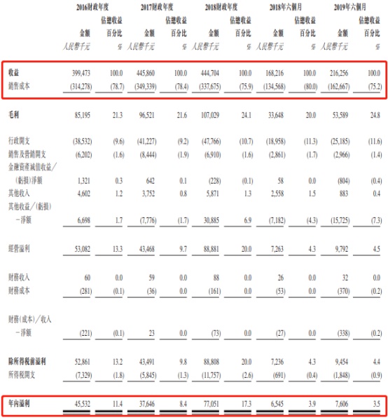 招股书显示,公司近三年的营收却并不稳定,2016年由3.99亿元(人民币,单位下同)增长至2017年约4.45亿元,而2018年却又略微下滑至4.44亿元。不过,2019年上半年营收较上年同期增长28.55%至2.16亿元。期内,公司的年内溢利亦是起伏不定,波动较为剧烈,2017年较上年滑坡后,又于2018财年激增至7705.1万元,然而同年的营收却在下降。