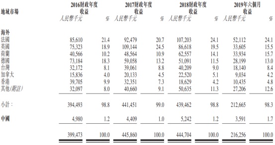 据了解,公司的大部分主要客户主要为欧洲知名家居装饰零售商或批发商,如法国J.J.A.(2016及2018年度最大客户)与荷兰Koopman(2018财年第二大客户)。对五大客户的销售额占近三年及2019上半年的总收益分别为48.1%、49.7%、54.3%及59.0%,呈现每年递增的趋势。2019上半年,最大单一客户的销售额占其总收益分别为20.2%。