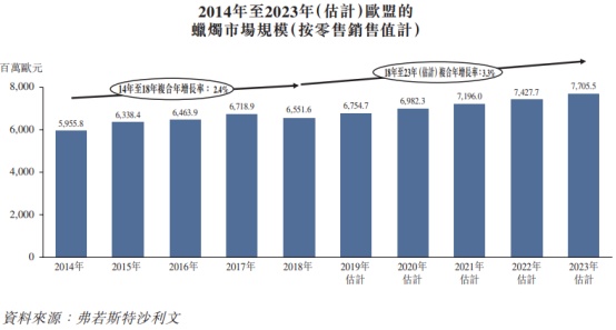 据了解,欧盟为2018年全球主要蜡烛及家居香薰消费市场。2018年,欧盟蜡烛消费占全球总蜡烛消费的43.4%,金额为151亿欧元。其中,欧盟以零售值计蜡烛的市场规模由2014年59.56亿欧元增加至2018年65.52亿欧元,2014年至2018年的复合年增长率为2.4%。