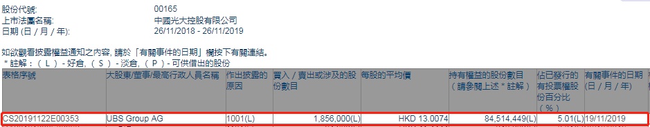 智通财经APP获悉,港交所最新资料显示,11月19日,瑞银增持光大控股(00165)185.6万股,每股作价13.0074港元,总金额约为2414.17万港元。增持后最新持股数目约为8451.44万股,最新持股比例为5.01%。