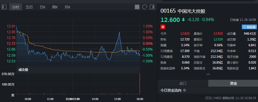截至今日收盘,光大控股(00165)跌0.94%,报12.60港元。