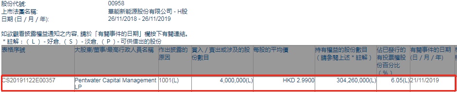 智通财经APP获悉,港交所最新资料显示,11月21日,Pentwater Capital Mgt增持华能新能源(00958)400万股,每股作价2.99港元,总金额为1196万港元。增持后最新持股数目约为3.04亿股,最新持股比例为6.05%。