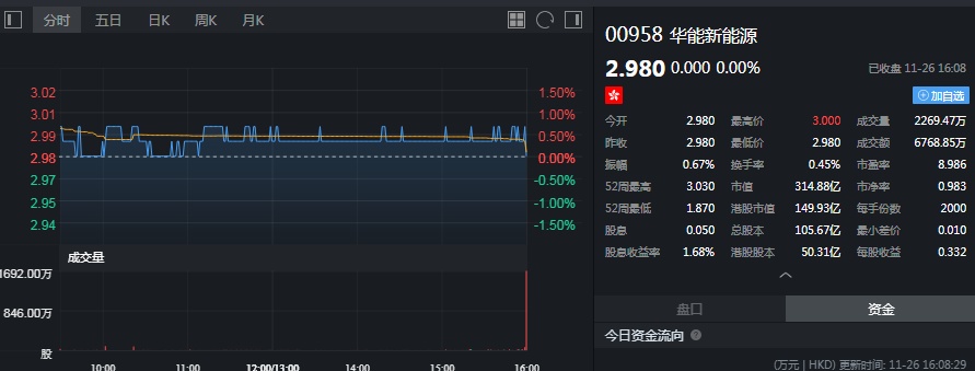 截至今日收盘,华能新能源(00958)无涨跌,报2.98港元。