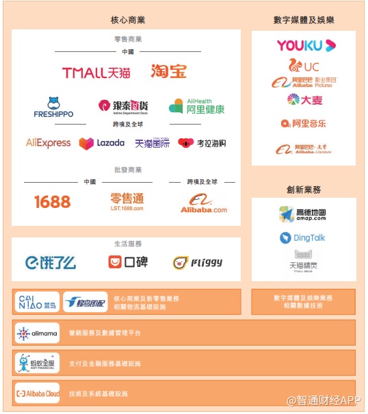 核心商业包括淘宝天猫在内的零售商业,1688.com和零售通等批发商业,菜鸟网络的物流商业以及饿了么、口碑组成生活服务商业;阿里的云计算业务则是以阿里云业务为主;在数字媒体及娱乐业务方面,阿里巴巴的业务范围主要集中在2大分发平台:优酷和UC浏览器,以及娱乐产业综合平台阿里影业;在创新业务上,阿里的发力点则着重在高德地图、钉钉和天猫精灵。