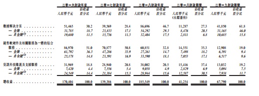 公司收益来源分为:(i)数据解决方案,占收益百分比为61.8%(ii)销售软硬件及相关服务为一体的综合服务,占收益百分比为19%。(iii)资讯科技维护及支援服务,占收益百分比为19.2%。三个收益来源构成综合业务模式,产生稳定收入,并有可观的利润率,也创造交叉销售机会,支撑可持续增长。2019年第一项收入4180万人民币,第二项为1291万元,第三项为1303万元。