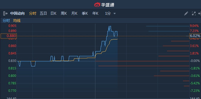 智通财经APP获悉,中国动向(03818)午间发布中期业绩,股东应占净利同比增长36.2%至1.88亿人民币,超市场预期,午后股价急升,截至13时42分,涨6.02%,报价0.88港元,成交额1549万。