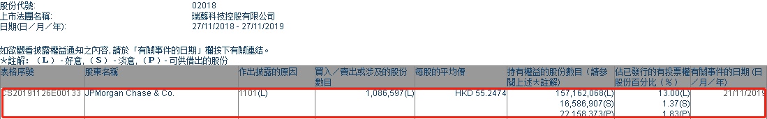 智通财经APP获悉,港交所最新资料显示,11月21日,摩根大通增持瑞声科技(02018)108.66万股,每股作价55.2474港元,总金额约为6003.17万港元。增持后最新持股数目约为1.57亿股,最新持股比例为13%。