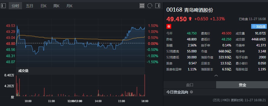 截至今日收盘,青岛啤酒(00168)涨1.33%,报49.45港元。