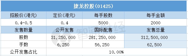 智通财经APP获悉,11月27日,捷隆控股(01425)配售结束。配售招股价区间为0.4-0.5港元,最终定价0.4港元,每手2000港元。