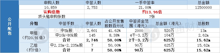 其中,公开配售申购人数为10859,一手中签率21%,认购倍数约13.96倍。
