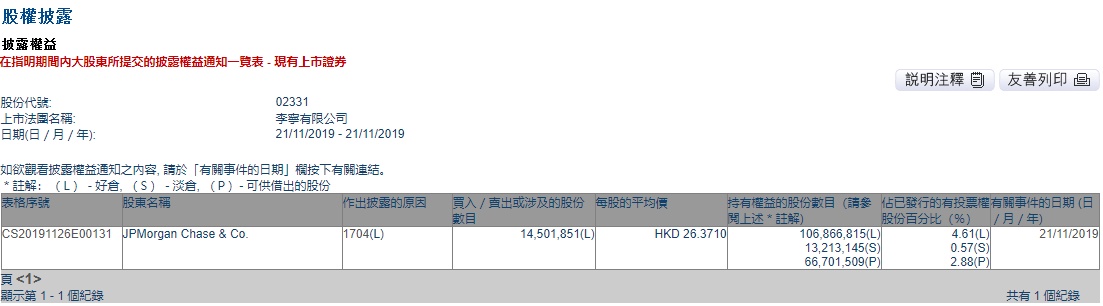 智通财经APP获悉,联交所最新资料显示,11月21日,摩根大通减持李宁(02331)