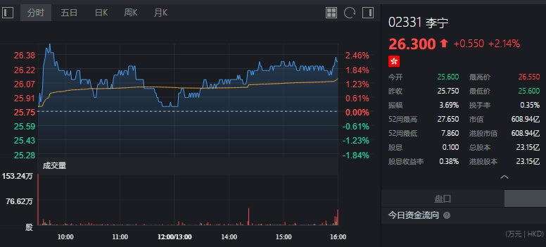 截至今日收盘,李宁涨2.14%,报26.3港元。