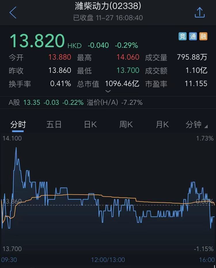 截至今日收盘,潍柴动力跌0.29%,报13.82港元。