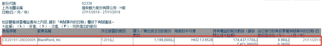 智通财经APP获悉,港交所最新资料显示,11月21日,贝莱德减持潍柴动力(02338)119.9万股,每股作价13.6526港元,总金额约为1636.95万港元。减持后最新持股数目为1.74亿股,最新持股比例为8.98%。