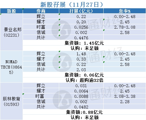 截至11月27日,辉立、耀才、时富、信诚为该公司借出近0.4476亿港元、2.03亿港元、0.0482亿港元,其中NOMAD TECH(08645)超购逾32倍,景业名邦(02231)、辰林教育(01593)认购未足额。