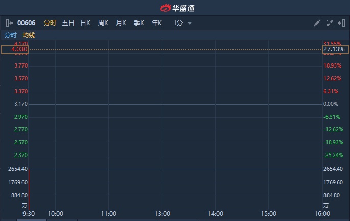 智通财经APP获悉,中国粮油控股(00606)公布,中粮集团有计划安排将中国粮油控股私有化。每股计划股份4.25港元的注销价较收市价每股3.17港元溢价约34.07%。中国粮油控股今日复牌,截至发稿,涨27.13%,报4.03港元,成交额1.07亿港元。