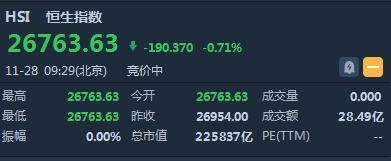 智通财经APP获悉,恒生指数早盘低开190.37点或0.71%,报26763.63点。国企指数跌0.84%,报10530.55点。红筹指数跌0.33%,报4267.69点。大市盘前成交28.49亿港元。