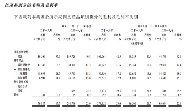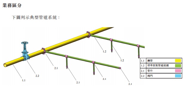 公司主要从事标准预制管道接头产品及钢管产品的制造和销售,供应各式各样长度、外径及表面抛光的产品,设计及供应各类组装管道系统,同时销售向供应商采购的未曾使用原材料,主要包括钢卷。2019年,公司有超过320名客户,大部分位于中国及其余分散在全球各地逾35个海外国家。客户主要包括天然气及HVAC公司、供水公司、基建及建筑公司、批发商及分销商。公司在济南经营两间厂房,在越南同奈省经营一间厂房。中国区销售占比在递减,海外区在增加。