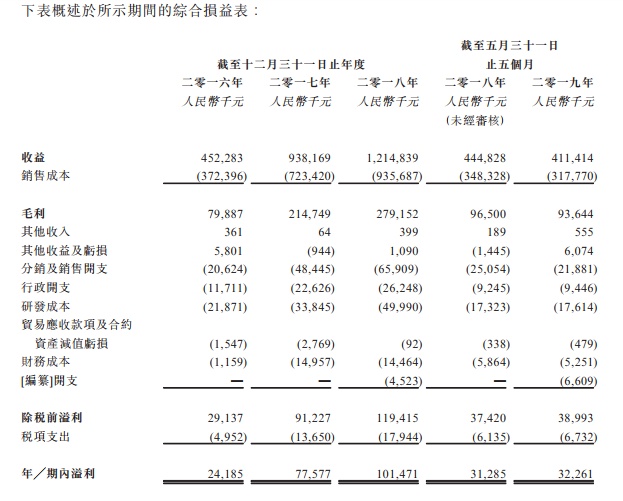 2016到2018年,迈科管业总收益为约人民币4.523亿元、9.382亿元及12.148亿元,而年内收益则分别为约人民币2420万元、7760万元及1.015亿元。