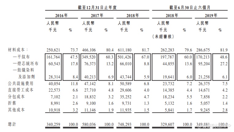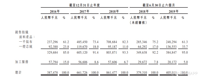 客户方面,于2016年至2018年度及截至2019年6月30日,购买公司纺织面料产品的客户主要包括服装制造商及贸易公司。来自最大客户的收占比分别约为14.0%、11.8%、14.5%及11.0%,而来自五大客户的收益占比分别约为42.6%、40.0%、38.6%及41.7%。
