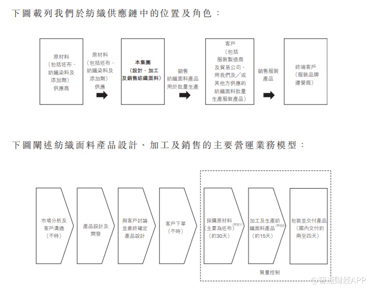 亚东集团主要从事设计、加工及销售纺织面料产品,亦仅提供加工服务。该公司的纺织面料产品可分为两大类,即(i)平纹布;及(ii)灯芯绒。纺织面料产品有各种各样的颜色、图案、纹理及功能。公司主要向服装制造商及贸易公司销售公司的纺织面料产品。据悉,于往绩期间,公司的大部分(或全部)纺织面料产品都被客户买去进一步加工,为服装品牌运营商(部分为国际或国内品牌运营商,如优衣库及森马)提供成品服装。于往绩期间,公司的纺织面料产品主要在中国、日本及亚洲若干其他市场(例如台湾、越南、孟加拉国及印尼)销售或分销。