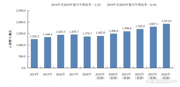 中国服装零售总值于2014年至2018年出现整体增长,由2014年的12563亿元增至2018年的13707亿元,复合年增长率约为2.2%。中国服装零售市场的零售总值增长的原因为:(1)可支配收入增加;(2)线上零售越来越普遍;及(3)个性化的观念不断增强。由于中国经济增速放缓对服装消费造成影响,自2015年以来零售总值的增幅收窄。尤其是,经济增速放缓以及中国股票和消费市场的持续下滑导致2018年中国服装零售值下降。于预测期间,在(1)城市化不断推进;及(2)中产阶级人口不断增加的带动下,预计零售总值将快速增长。零售总值预期由2019年的14020亿元增至2024年的19130亿元,复合年增长率约为6.4%。