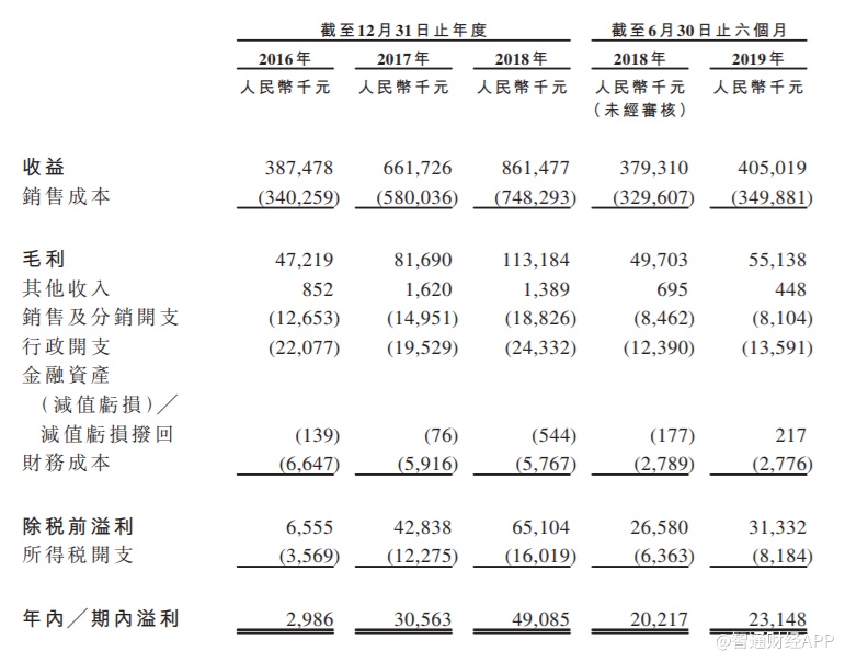 招股书显示,2016年至2018年度及截至2019年6月30日,该公司收益分别为3.87亿元、6.62亿元、8.61亿元及4.05亿元;毛利分别为4721.9万元、8169万元、1.13亿元及5513.8万元;年内/期内溢利分别为298.6万元、3056.3万元、4908.5万元及2314.8万元。