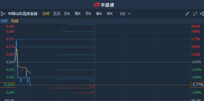 智通财经APP获悉,山东高速金融(00412)遭昊天国际建投(01341)减持3亿股,总代价约为7500万港元。截至9时58分,跌5.77%,报价0.245港元,成交额达1.773亿。