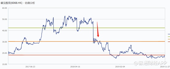 可以看到职业教育部分的增速远超高教,且收入贡献越来越大,这跟政策支持不无关系。不过虽然公司的收入增长较快,但是毛利率却同比下降了将近4个百分点,净利率下降了近8个百分点,盈利能力出现较为明显的下滑。而且从2018财年的业绩情况来看,2019财年的增长属于低位增长。因此虽然公司股价长期处于盘整状态,但同样也还有估值较高的风险,未来的股价上升还需要更强的业绩支撑。