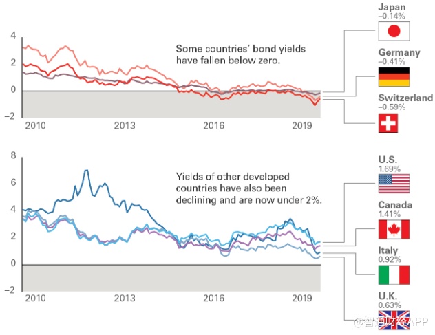 值得注意的是,一些国家(如日本、德国等)的债券收益率已经为负,而在一些发达国家(如美国,意大利等),其政府发行的债券收益率已经低于2%,且仍处于下行的通道。