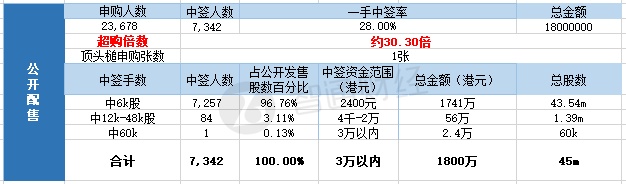 其中,公开配售申购人数23678,一手中签率28%,超购倍数约30.3倍。