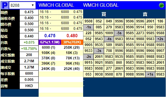 智通财经APP获悉,WMCH GLOBAL(08208)将于11月29日挂牌,该股暗盘盘初拉升,截止到发稿,辉立证券暗盘交易显示其报价0.475港元,较招股价0.4港元涨18.75%。每手6000股,不计手续费,每手赚450港元。