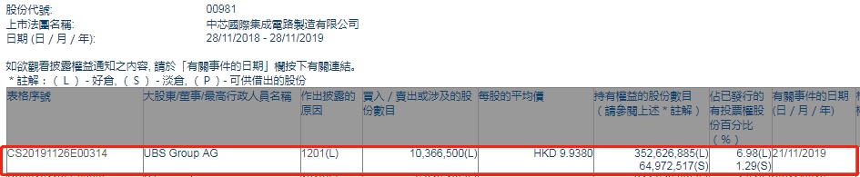 智通财经APP获悉,港交所最新资料显示,11月21日,瑞银减持中芯国际(00981)1036.65万股,每股作价9.938港元,总金额约为1.03亿港元。减持后最新持股数目为3.53亿股,最新持股比例为6.98%。