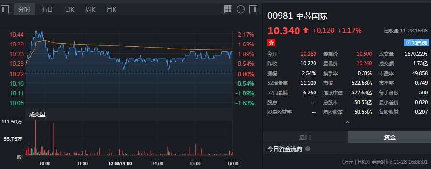 截至今日收盘,中芯国际(00981)涨1.17%,报10.34港元。