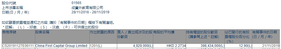 智通财经APP获悉,港交所最新资料显示,11月21日,China First Capital Group减持成实外教育(01565)492.9万股,每股作价2.27港元,总金额约为1118.88万港元。减持后最新持股数目约为3.98亿股,最新持股比例为12.9%。
