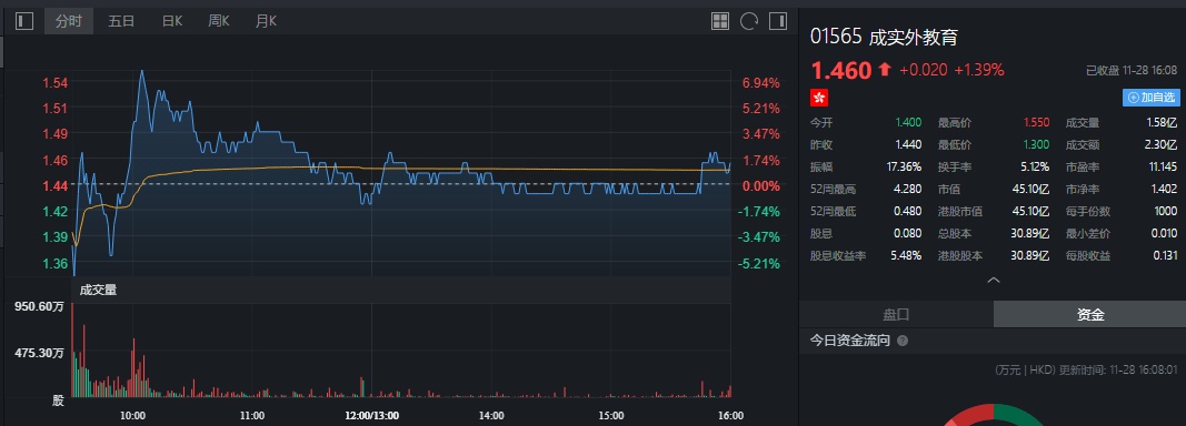 截至今日收盘,成实外教育(01565)涨1.39%,报1.46港元。