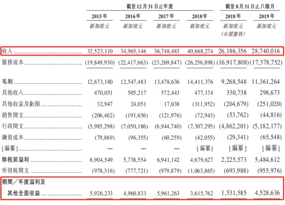 招股书显示,公司近四年的营收呈现不断增长的态势,2015年由3252.31万元(新加坡元,单位下同)稳定增长至2018年约4066.82万。2019年首八月营收较上年同期增长9.75%至约2874万元。