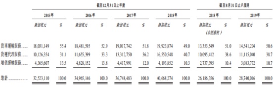 细分业务来看,货车运输服务是公司的支柱业务,期内该业务产生的收益分别占总收益55.4%、52.9%、51.8%、49.0%及50.6%。货运代理业务所贡献收入的比重逐年提升,至2018年甚至达到了40.7%,而增值运输服务所贡献营收一直稳定保持在总营收的10%左右。